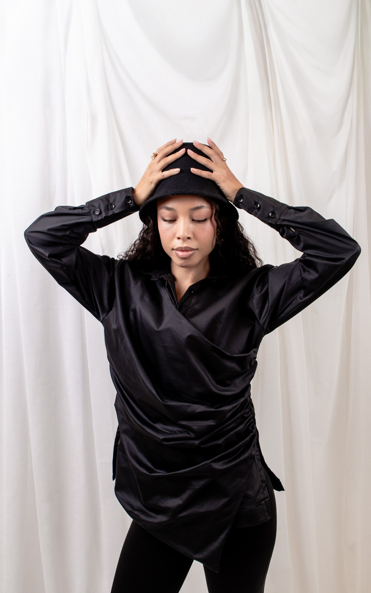Le chemisier Dera allie élégance intemporelle et modernité audacieuse. Sa coupe asymétrique drapée et son col châle sophistiqué en font une pièce statement qui sublime toutes les silhouettes. Parfait pour un look chic et affirmé, il se porte aussi bien avec un pantalon tailleur qu’un jean pour un style plus décontracté.